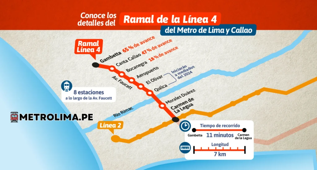 La ruta denominado ramal abarca desde la avenida Óscar Benavides hasta la avenida Néstor Gambetta. El ramal, futura Línea 4 del Metro de Lima, se unirá con la Línea 2 y constará de 8 kilómetros y 8 paradas que se recorrerá en 13 minutos.